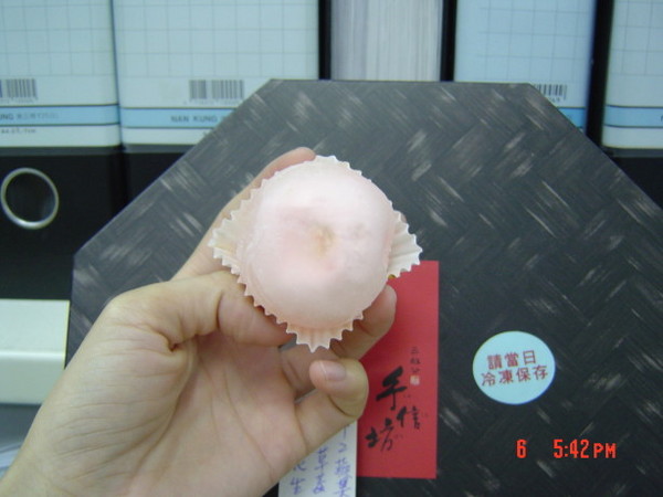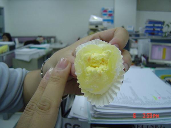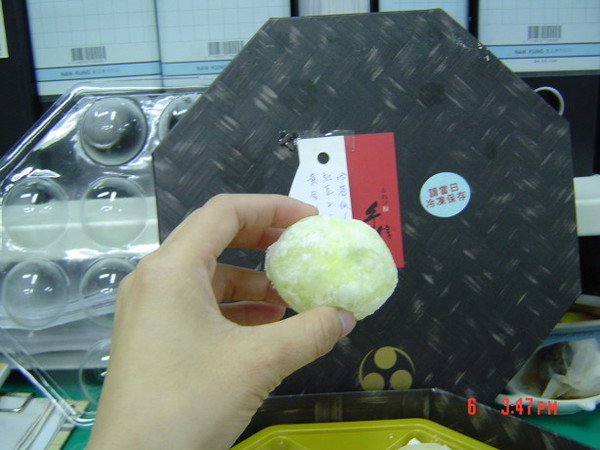 我第一個吃的是「哈密瓜優格」,咬下去的第一個感覺是:「好滑喲!」那個外層的麻糬Q滑到一個不行,和一般的麻糬不太一樣,會有一種不小心就會全部吞下去的感覺<因為很滑>,就像是在喝珍珠奶茶,不小心吸太大力會直接把珍珠吞進去一樣的感覺。呵呵!好奇怪的形容詞。因為剛送來還冰冰的,吞下去的第一口,當場暑氣全消。